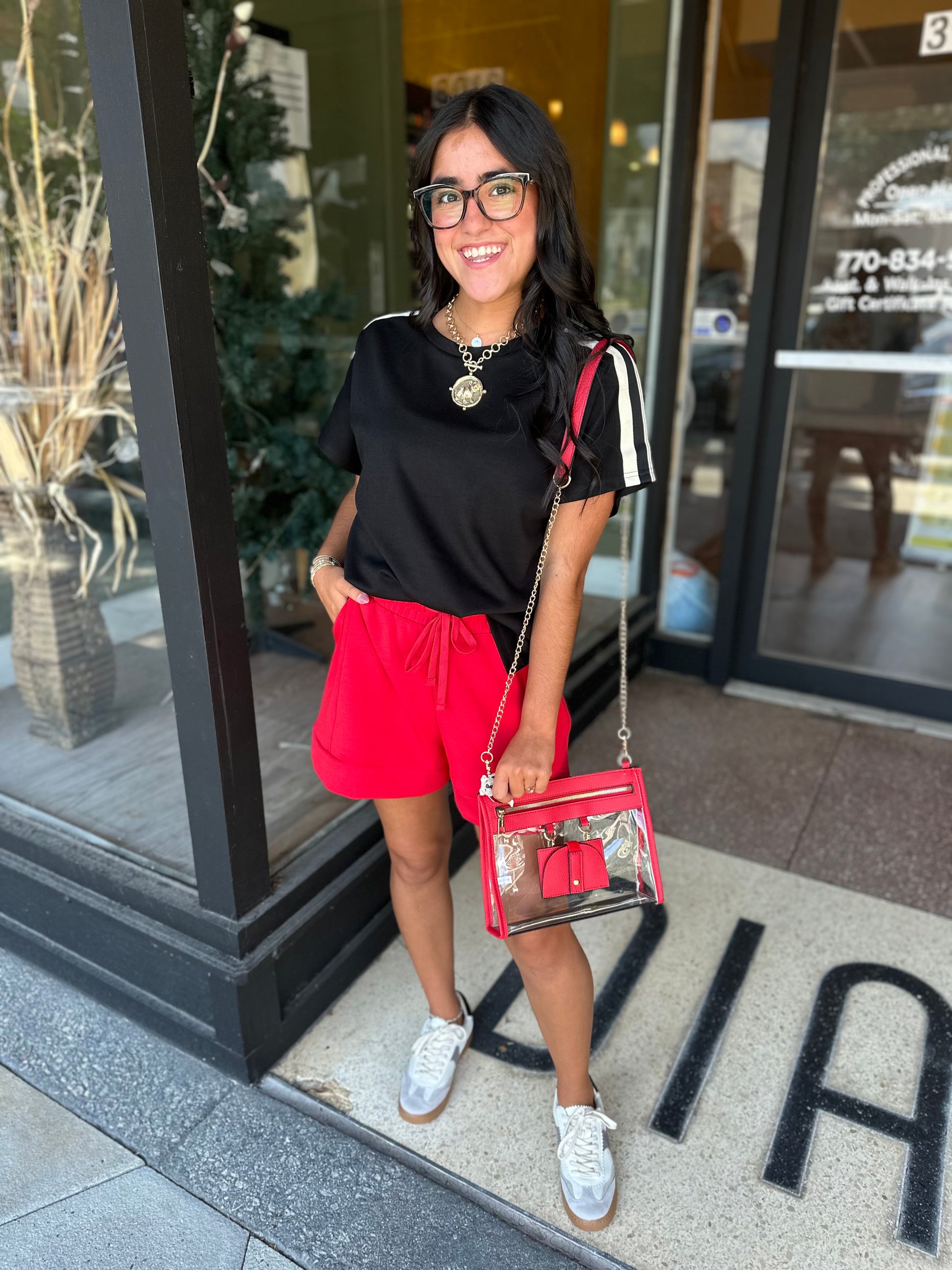 Buttery soft red top with black and white stripe detail at shoulders and slits on the side of the top.